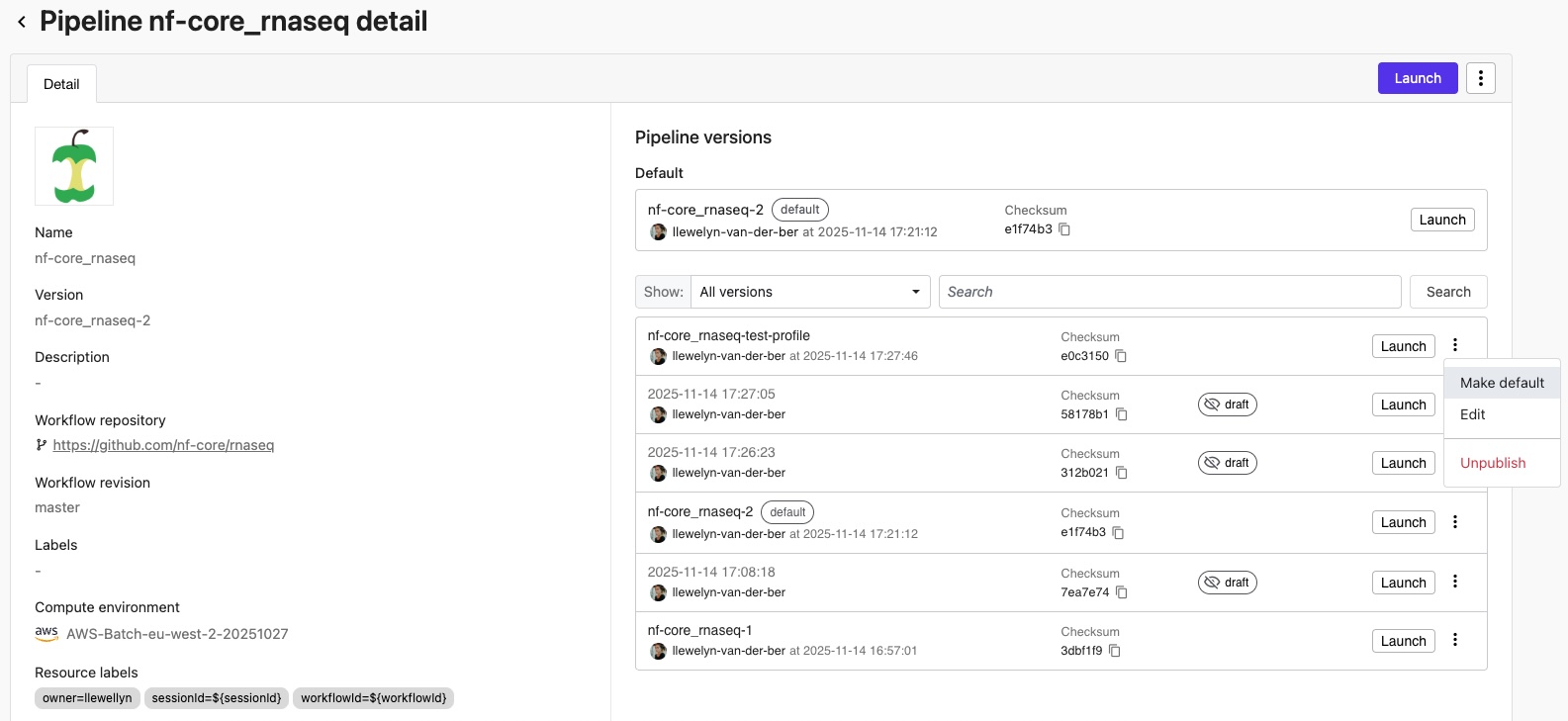Seqera maintains a history of all draft and published versions, providing an audit trail of pipeline evolution.